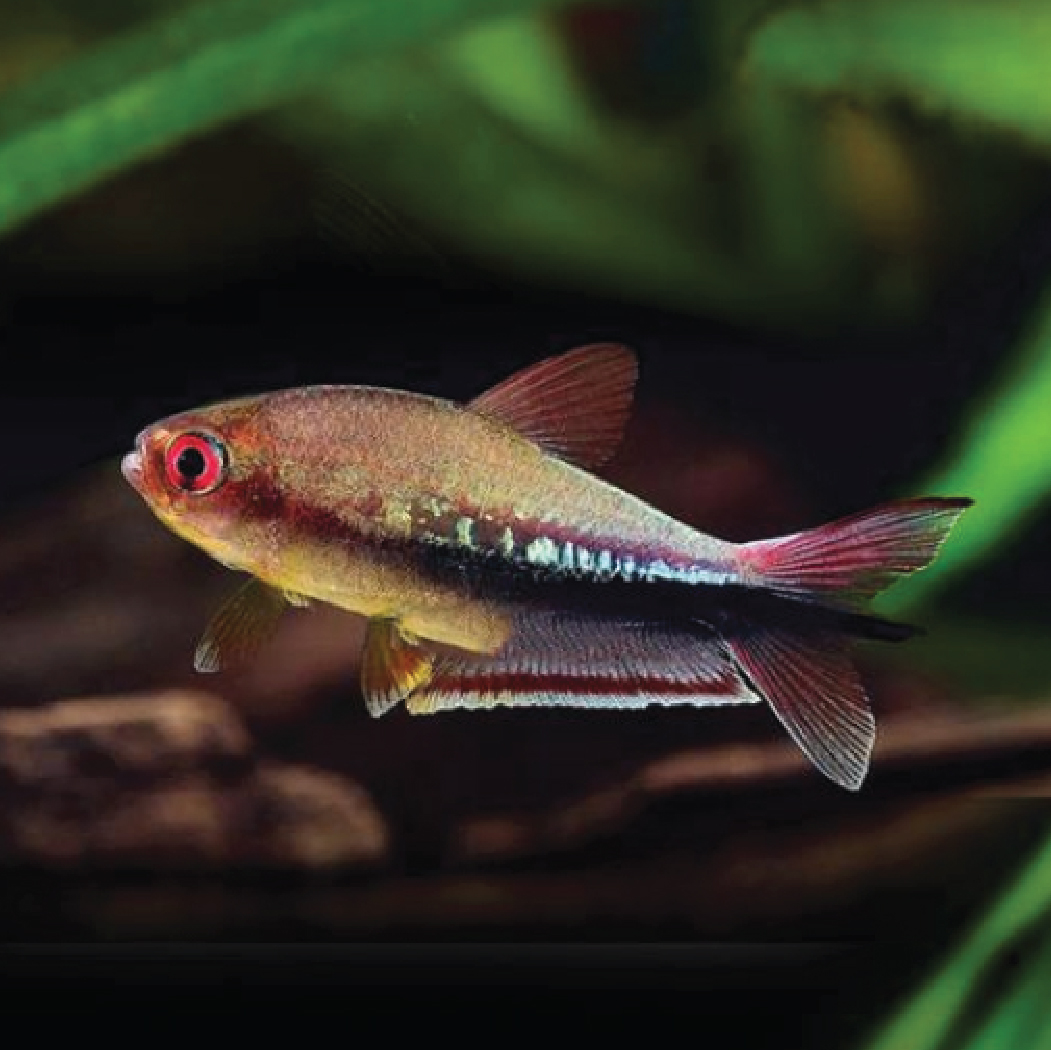The Rainbow Emperor Tetra, named for its vibrant and rainbow-like colors when in full display, is a striking and colorful fish. With its fiery red eyes, iridescent metallic sheen on its body, and dazzling colors when in an excited state, it frequently steals the spotlight among small tetra species.